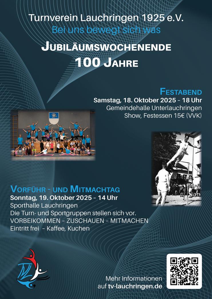 An unserem FESTABEND am 18. Oktober 2025 werden wir gemeinsam mit unseren Mitgliedern und Freunden des Turnvereins in der Gemeindehalle Unterlauchringen bei spektakulären Showacts und einem Festbankett gebührend unser 100-jähriges Jubiläum feiern!
