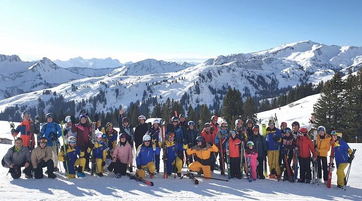 Hier die 70 Teilnehmer und ihre Ski- & Snowboardlehrer am sonnigen Sonntagmorgen auf dem Seebuck!