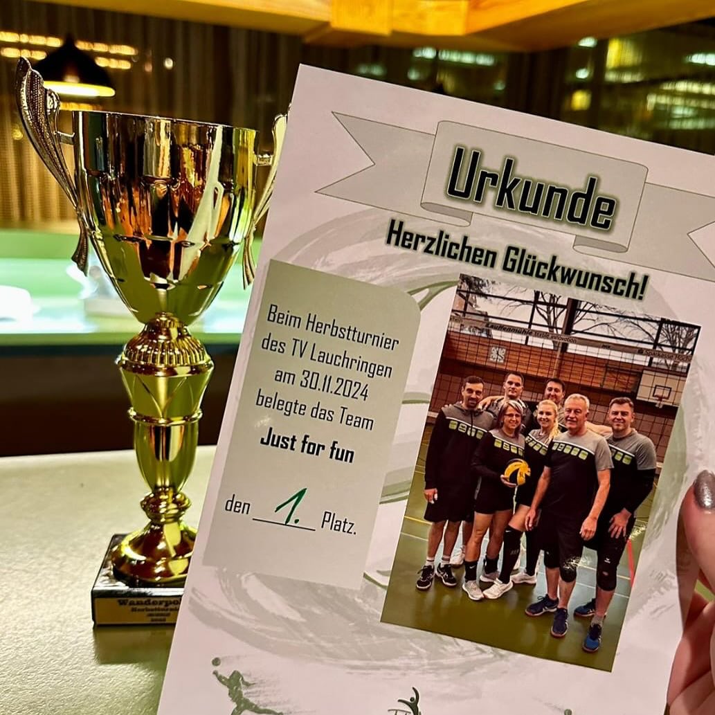 -Gewonnen hat die 1. Mannschaft von TVL. (Bild mit Pokal und Urkunde).