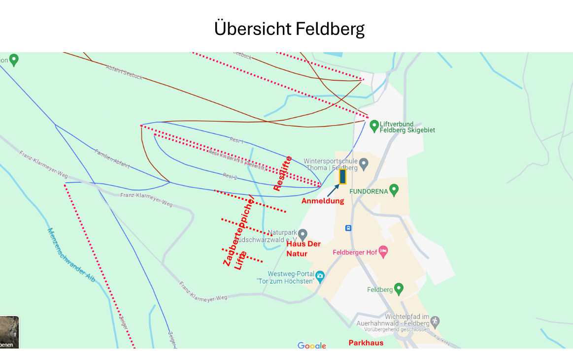 Wir waren heute Nachmittag auf dem Feldberg, die Bedingungen passen und die Kurse finden Morgen definitiv auf dem Feldberg, Seite Seebuck, statt. Bitte um 8:15 Uhr oben sein, das Auto im Parkhaus parken und dann zur Anmeldung beim Rothauschalet kommen. Im Screenshot seht ihr wo was zu finden ist!
