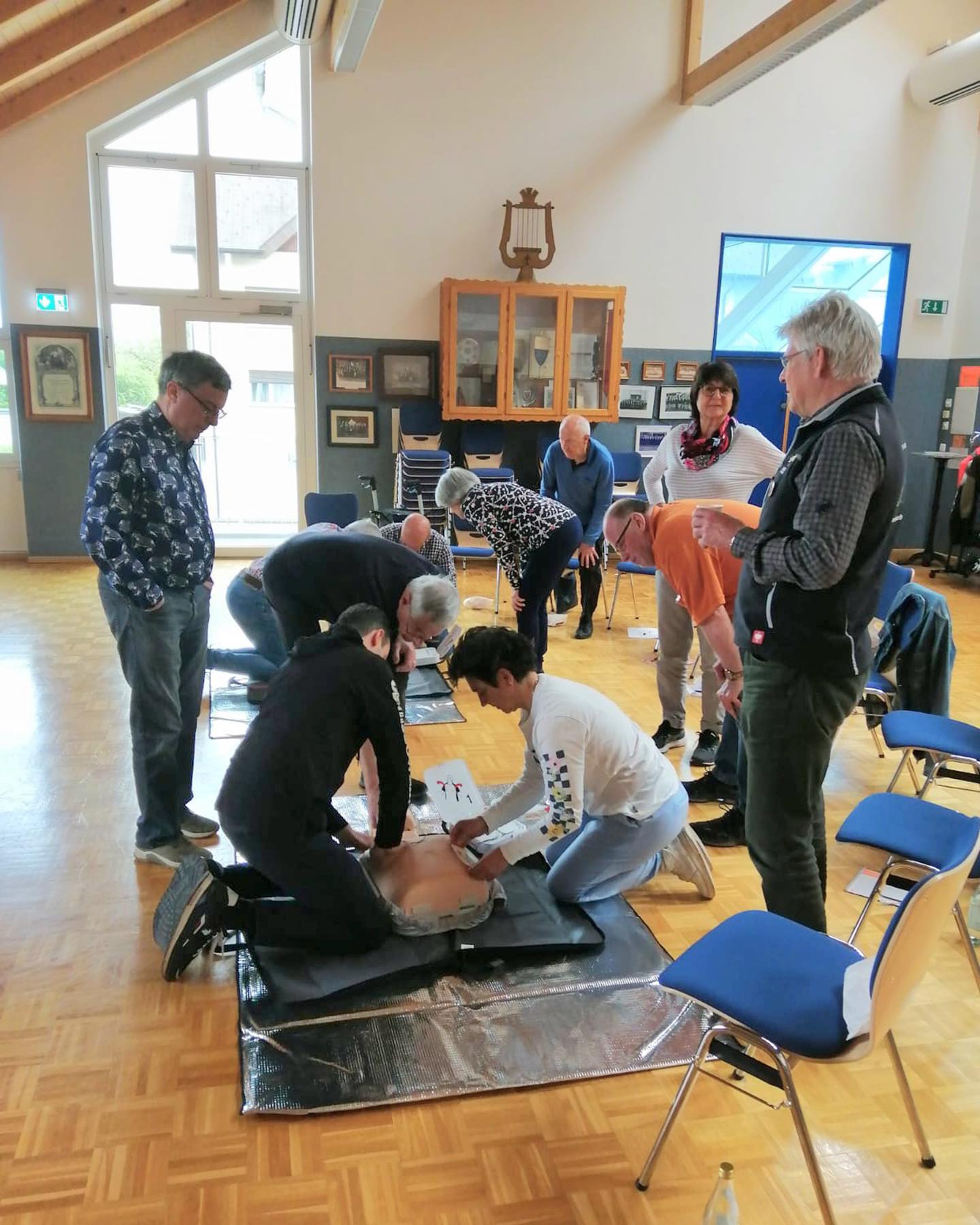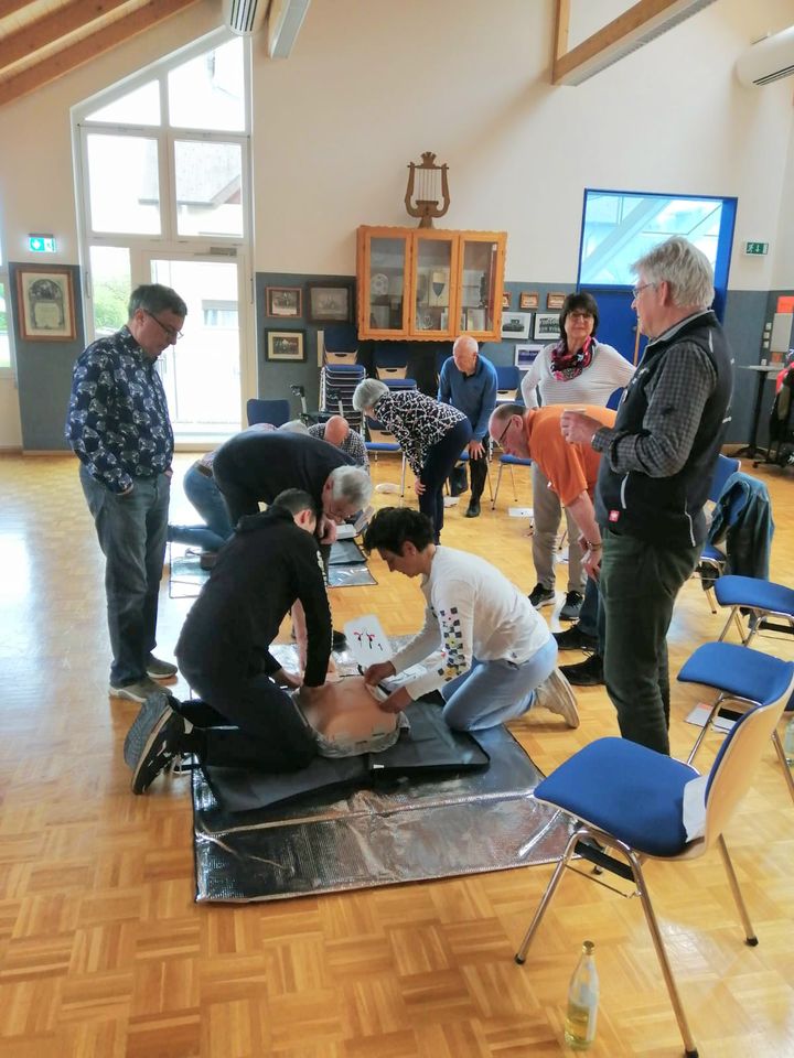 Nothelferkurs mit Schwerpunkt Kreislaufprobleme und Defibrillator: Am Samstag, 20 Mai trafen sich 10 Übungsleiter in der Halle in UL und wurden zum Thema Erste Hilfe bei Kreislauf-Problemen und Verwendung eines Defibrillators, geschult. Diese Schulung wurde durch Edelbert Gantert vom Roten Kreuz und von Dr. Kirchhoff durchgeführt. Dabei lernten wir, dass wir bei solchen Problemen mit einer schnellen und richtigen Handlungsweise Leben retten können. Ein herzliches Dankeschön an die beiden Ausbilder für Ihren Einsatz und auch für die sehr kompetente Schulung. Ein Dankeschön auch an die Teilnehmer, dass sie sich die Zeit für diesen Kurs genommen haben.
