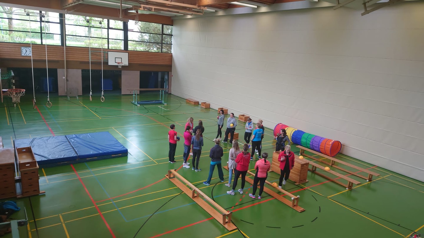 Abenteuer Turnhalle. Ca. 30 ÜbungsleiterInnen aus dem Turngau lassen sich in verschieden Arbeitskreisen schulen. Man sieht, dass sie mit Spaß und Freude dabei sind.