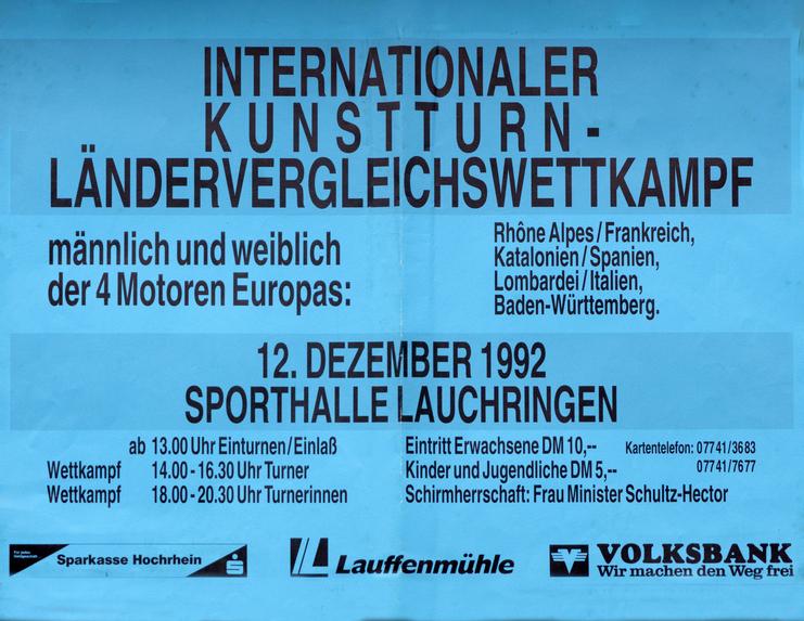 | 1992 | Kinderturnfest des MHTG in Lauchringen mit 1000 Teilnehmern. / 12. & 13. Dezember Kunstturn-Vergleichswettkampf der" 4 Motoren Europas" Katalonien/Spanien, Lombardei/Italien, Rhones Alpes/Frankreich, Baden-Württemberg |